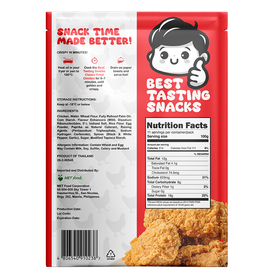 Ingredients: Chicken, Water, Wheat Flour, Fully Refined Palm Oil, Com Starch, Flavour Enhancers (MSG, Disodium Ribonucleolides), Iodized Sall, Rice Flour, Egg Powder, Paprika as Natural Colorant, Raising Agents (Pentasodium Triphosphate, Sodium Hydrogen Carbonate), Spices (Black & White Pepper, Garlic), Sugar, Modified Tapioca Starch.