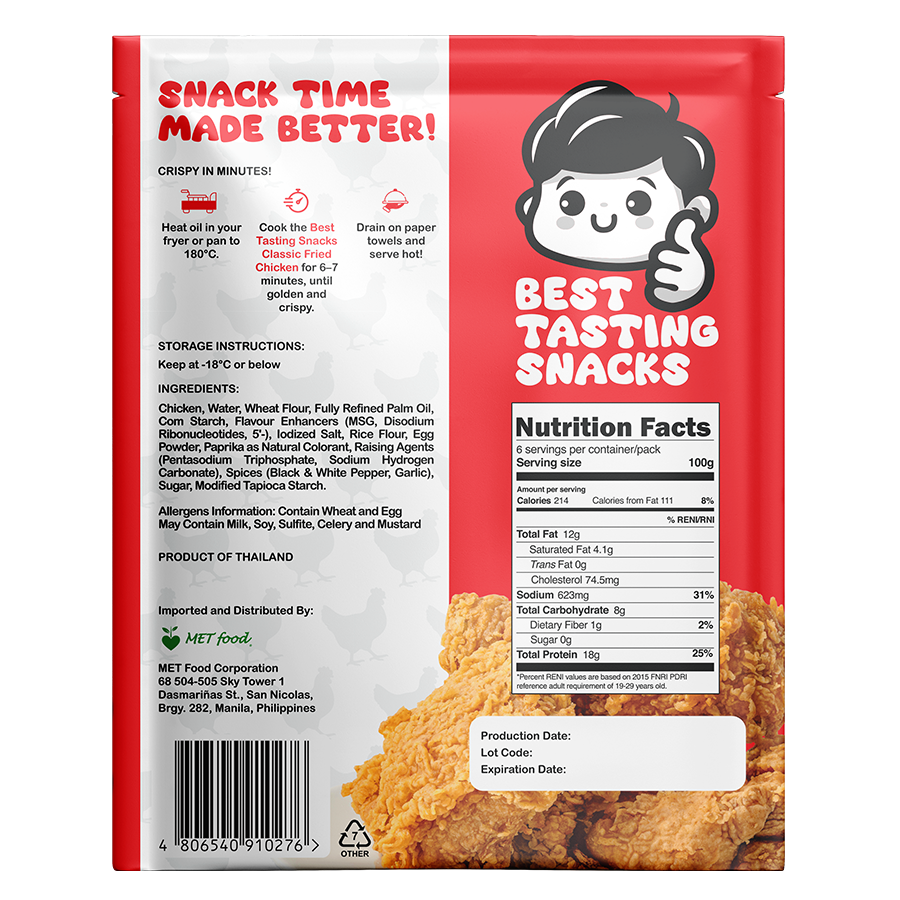 Ingredients: Chicken, Water, Wheat Flour, Fully Refined Palm Oil, Com Starch, Flavour Enhancers (MSG, Disodium Ribonucleolides), Iodized Sall, Rice Flour, Egg Powder, Paprika as Natural Colorant, Raising Agents (Pentasodium Triphosphate, Sodium Hydrogen Carbonate), Spices (Black & White Pepper, Garlic), Sugar, Modified Tapioca Starch.