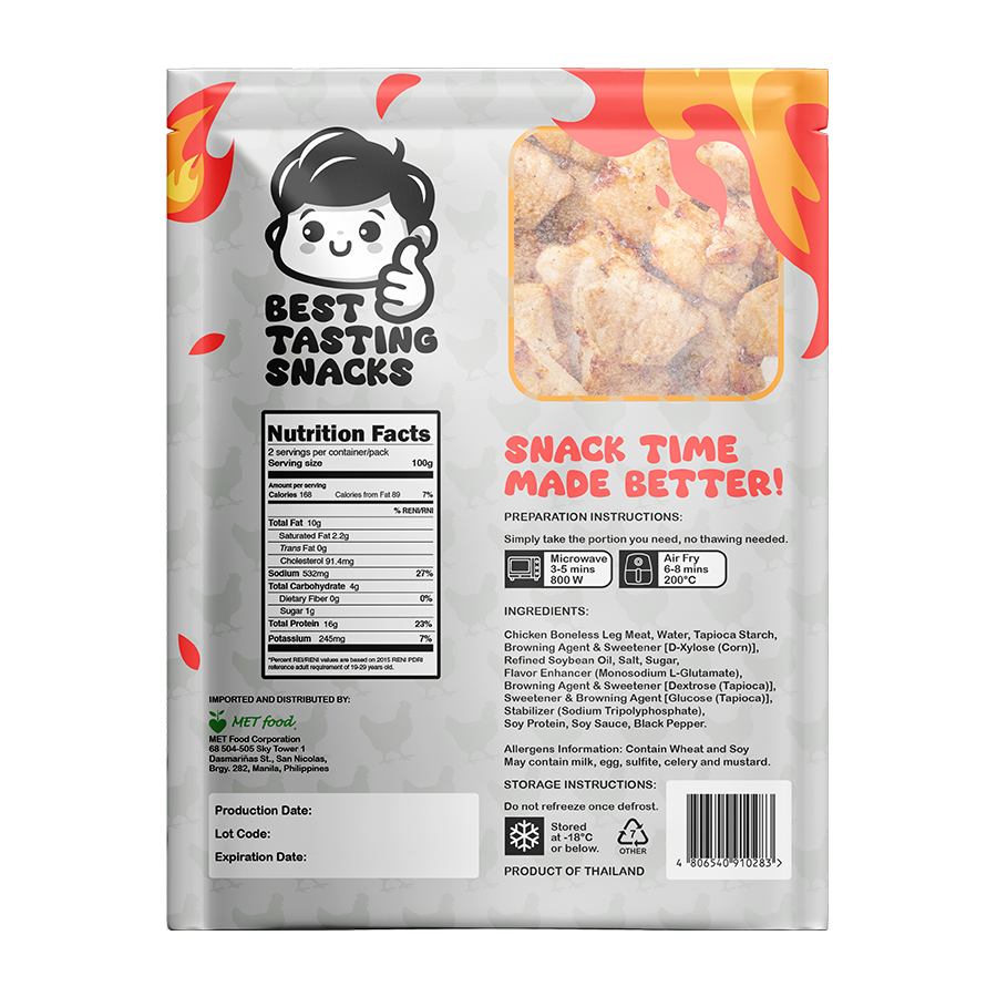 Ingredients: Chicken Boneless Leg Meat, Water, Tapioca Starch, Browing Agent & Sweetener (D-Xylose (Corn)), Refined Soybean Oil, Salt, Sugar, Flavor Enhancer (Monosodium L-Glutamate), Browning Agent & Sweetener (Dextrose (Tapioca)), Sweetener & Browning Agent (Glucose (Tapioca)), Stabilizer (Sodium Tripolyphosphate), Soy Protein, Soy Sauce, Black Pepper.
